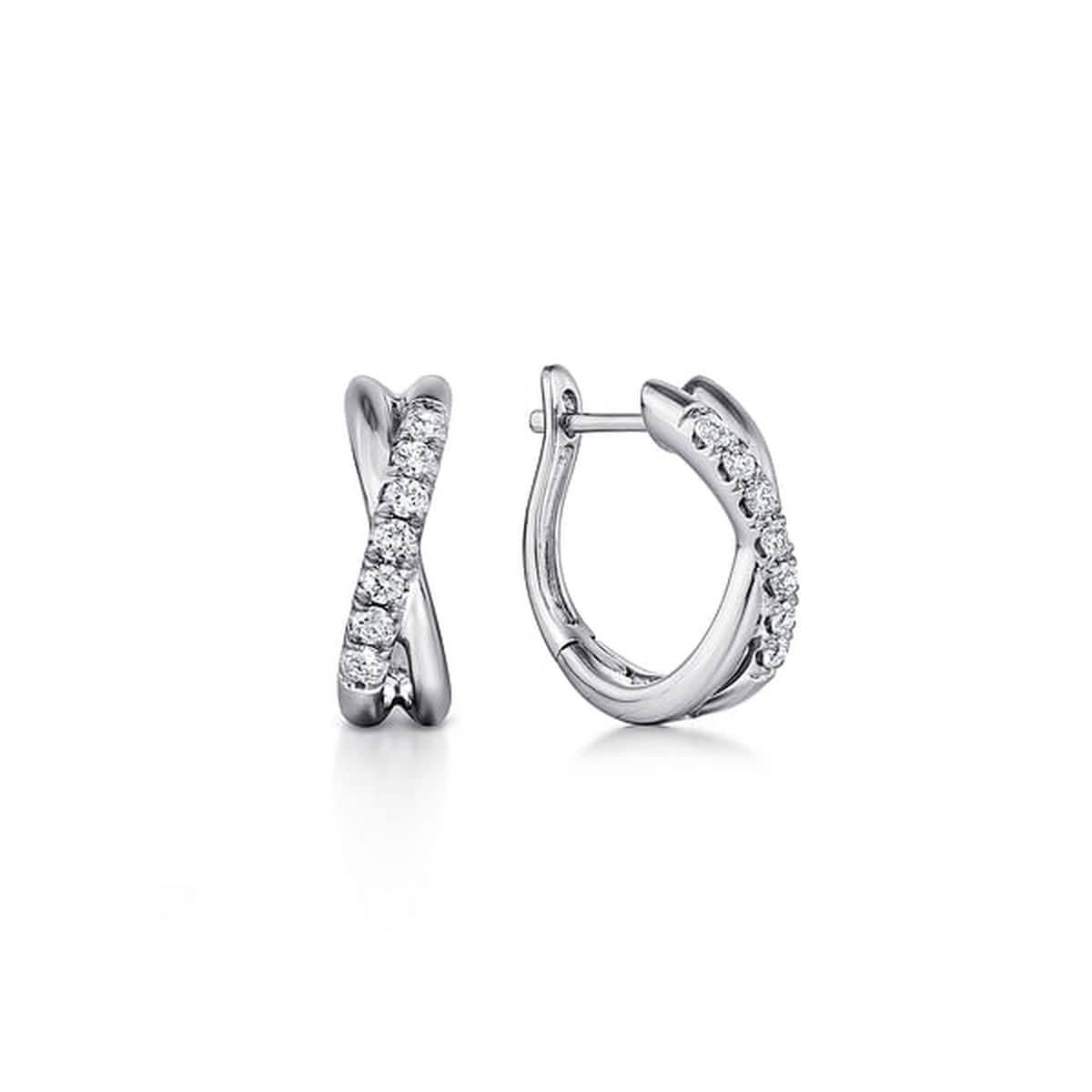 In a stylish twist, a strand of pave diamonds wraps around a strand of polished white gold to create these darling huggie earrings