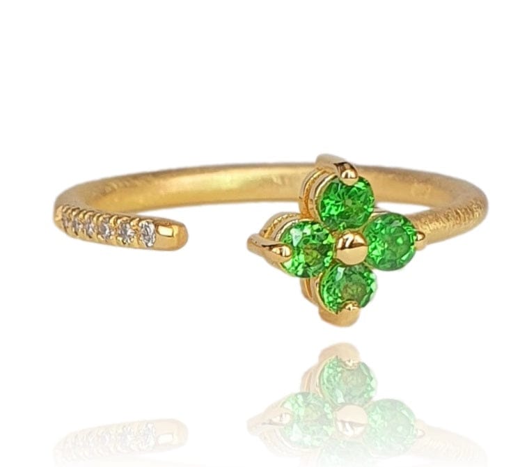 This 14K yellow gold ring showcases a delicate floral design centered on a 0.30-carat tsavorite, a vibrant green garnet prized for its brilliance and rarity. Diamond accents totaling 0.03 carats enhance the composition with subtle luminosity. At approximately 1.8 grams, the refined gold weight prioritizes comfort and wearability while maintaining presence. The open-band silhouette creates an airy, contemporary aesthetic that complements rather than overwhelms the hand. An exceptional choice for collectors seeking distinctive color and botanical inspiration in a piece that transitions effortlessly from casual to formal occasions.