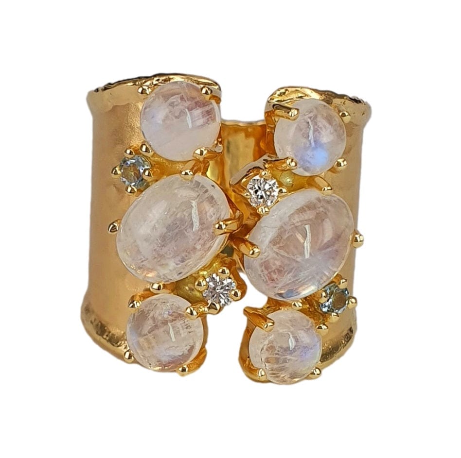 This 14K yellow gold ring showcases a refined composition: a 0.12-carat aquamarine paired with a striking 5.20-carat rainbow moonstone, accented by 0.10 carats of diamonds. Weighing approximately 6.2 grams, the piece balances presence with wearability. The open-band design creates an understated elegance suited to both daily wear and special occasions, making it a versatile addition to any collection.