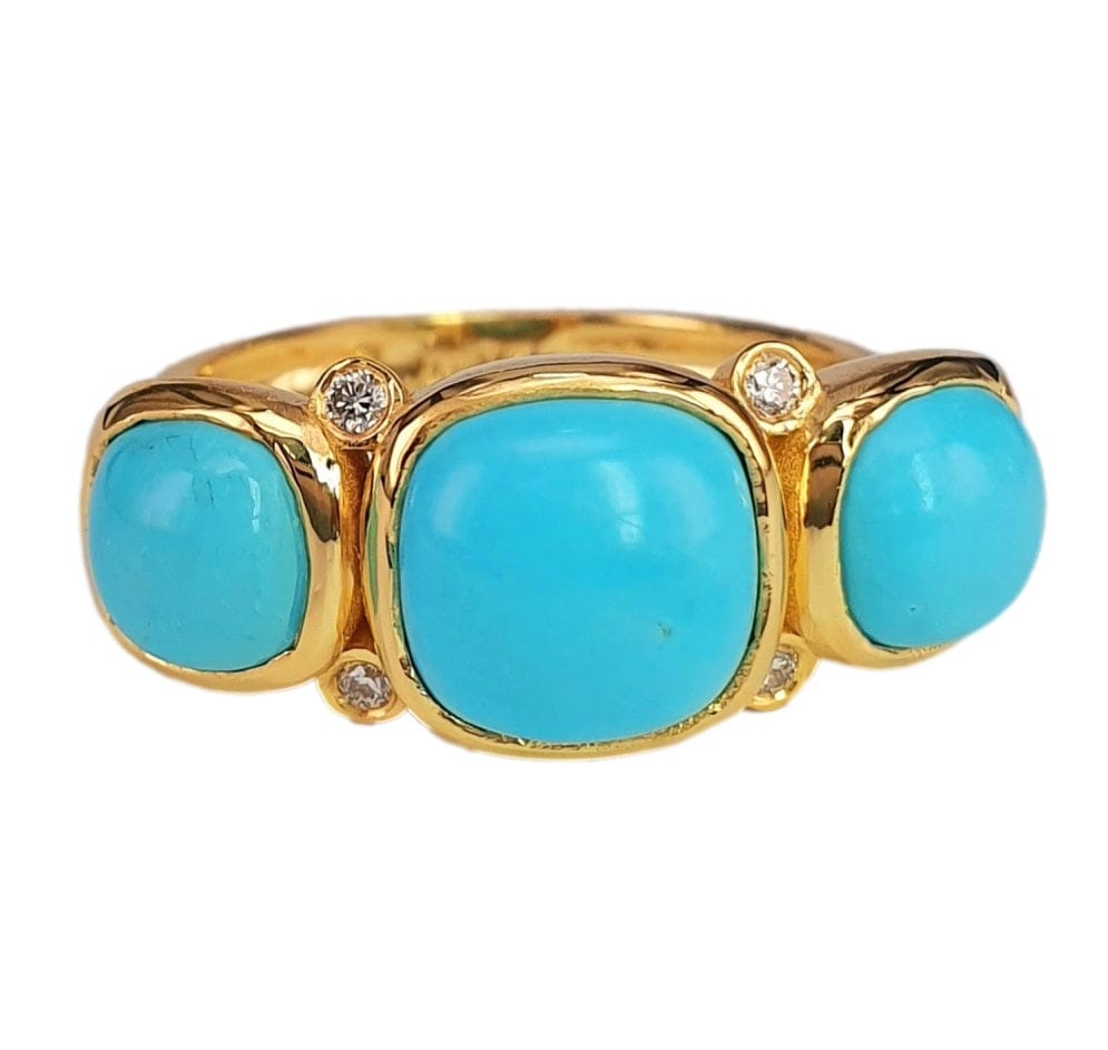 This distinctive three-stone ring combines 14K yellow gold with vibrant turquoise (3.00ct) and delicate diamond accents totaling 0.06 carats, creating a harmonious blend of color and sparkle. Weighing approximately 5.6 grams, the piece delivers substantial craftsmanship with refined proportions. The thoughtful design bridges contemporary artistry with timeless appeal, making it equally suited to daily wear or as a statement piece for special occasions.