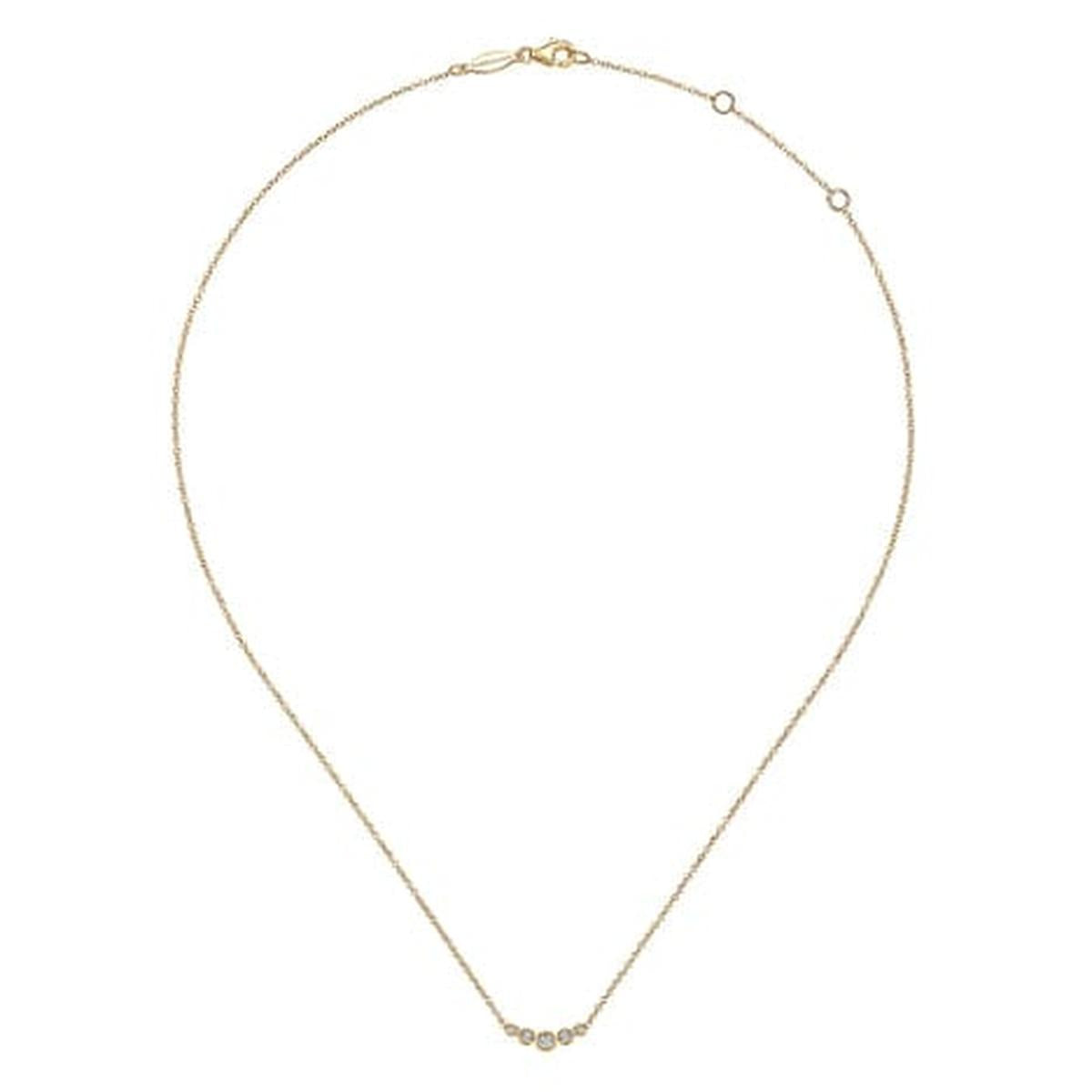 Petite diamond additions add a touch of luxury to any jewelry piece. This necklace features a 14K yellow gold construction. Delicate milgrain details surround dainty bezel-set .09 ct diamonds, placed in a graduated design pattern. Minimal craftsmanship and luxurious undertones make this style a must-have.