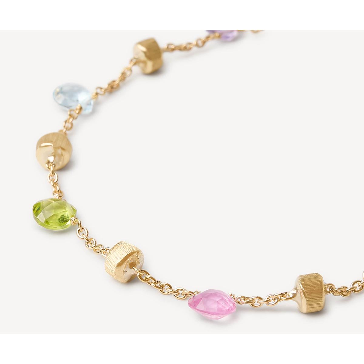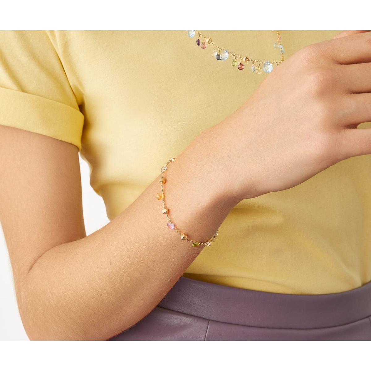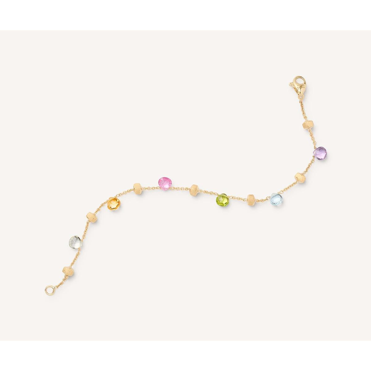 18K yellow gold bracelet with tabeez cut multi-colored semi-precious gemstones. A timeless and playful Marco Bicego classic, this Paradise Multicolor Gemstone Bracelet is hand engraved by Italian artisans and composed of hand picked stones.