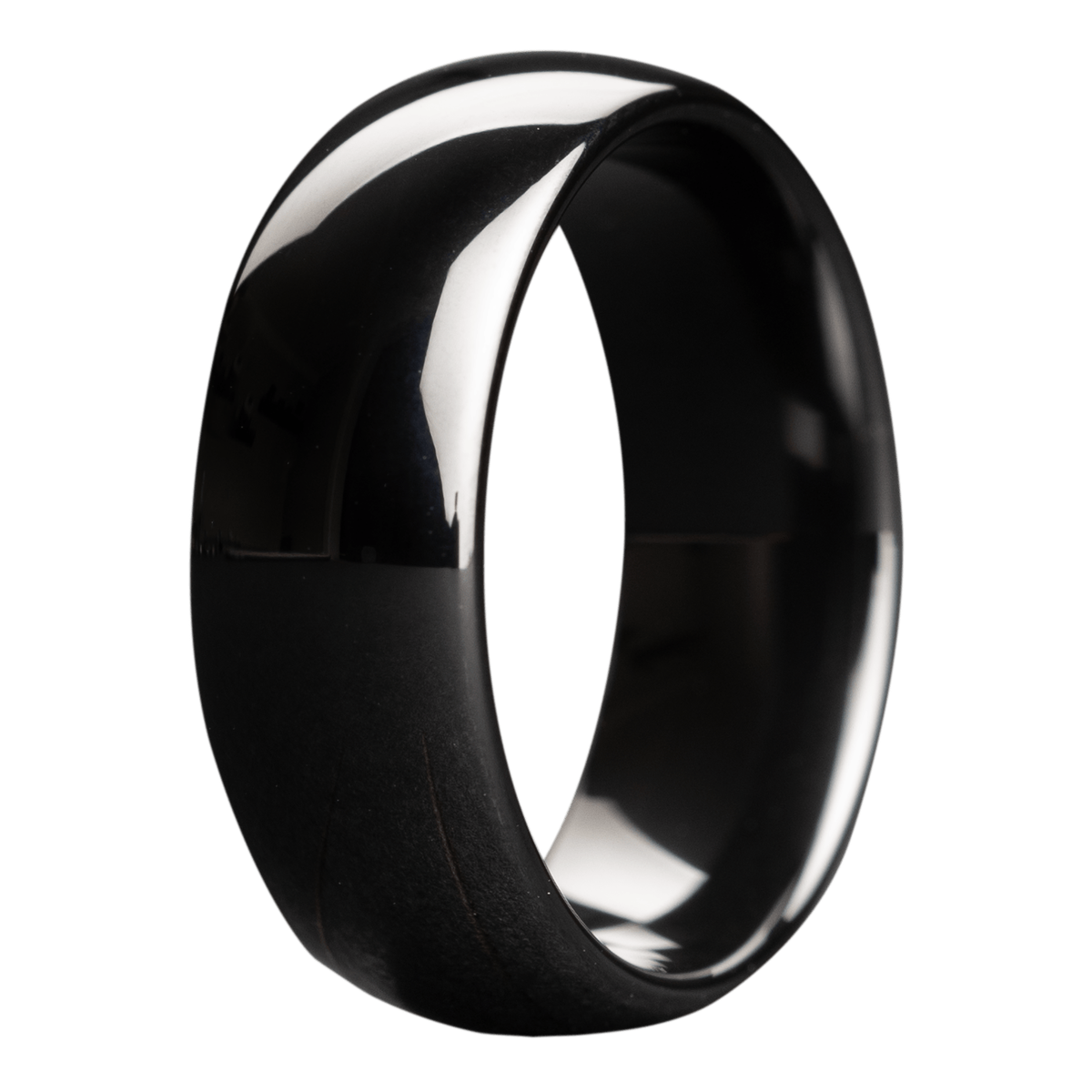 This black ceramic, high-polish, dome ring comes in a variety of MM widths. Black ceramic is a fantastic choice, as it's an incredibly durable material and it is black all the way through. Any nicks and scratches will not chip away its color.