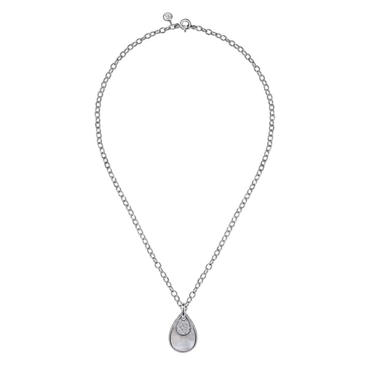 This dazzling pendant necklace made of Sterling Silver features a pear-shaped centerpiece of white mother-of-pearl wonderfully accentuated by white sapphires. It brightens any ensemble.