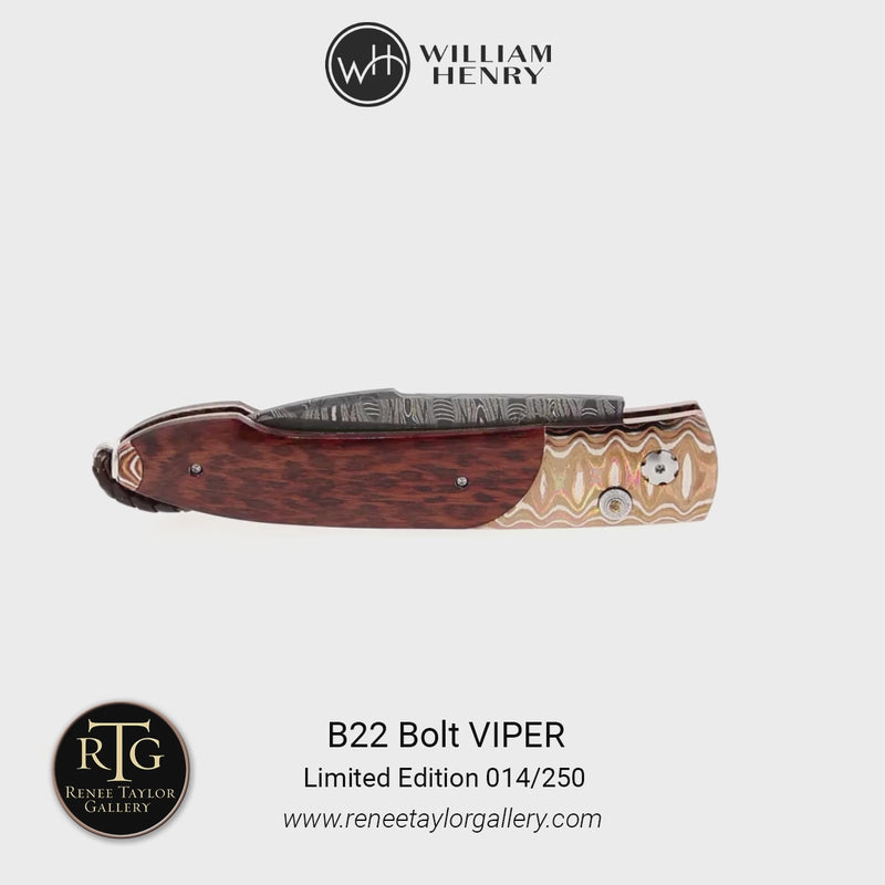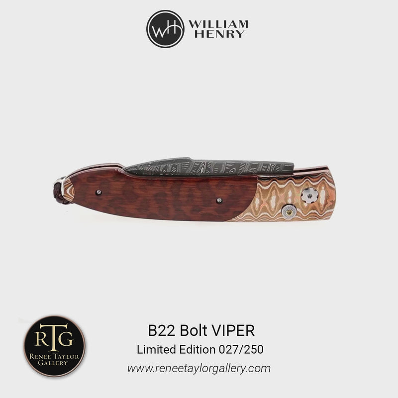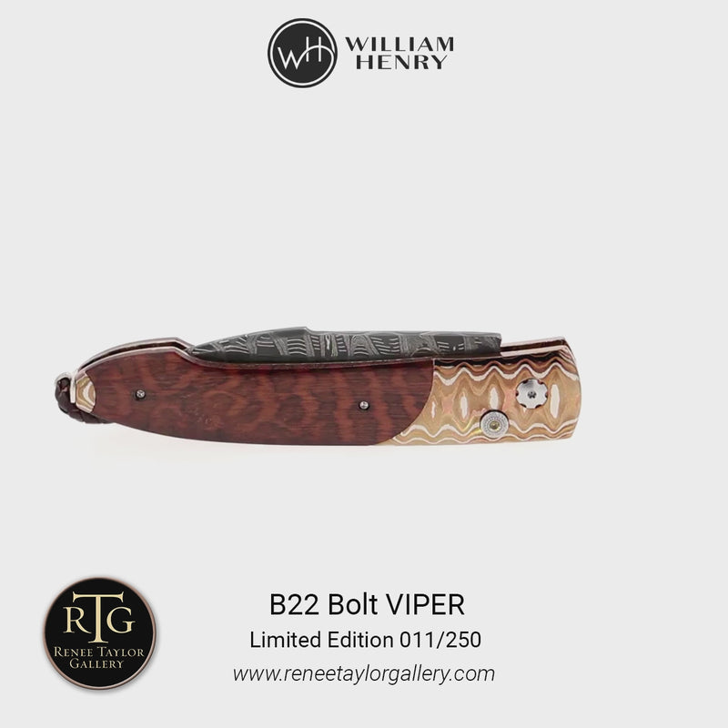 The Bolt 'Viper' delivers a fresh take on our signature pocketknives, combining a swift automatic opening blade with a secure grip for effortless daily use. True to William Henry’s philosophy, 'where superlative function meets superlative art', this model’s action has been refined to perfection, elevating your experience to a new level. Every knife is meticulously fashioned from exotic materials and hand-forged metals, and each detail reflects our commitment to timeless design and impeccable performance, making the Bolt worthy of appreciation for a lifetime.