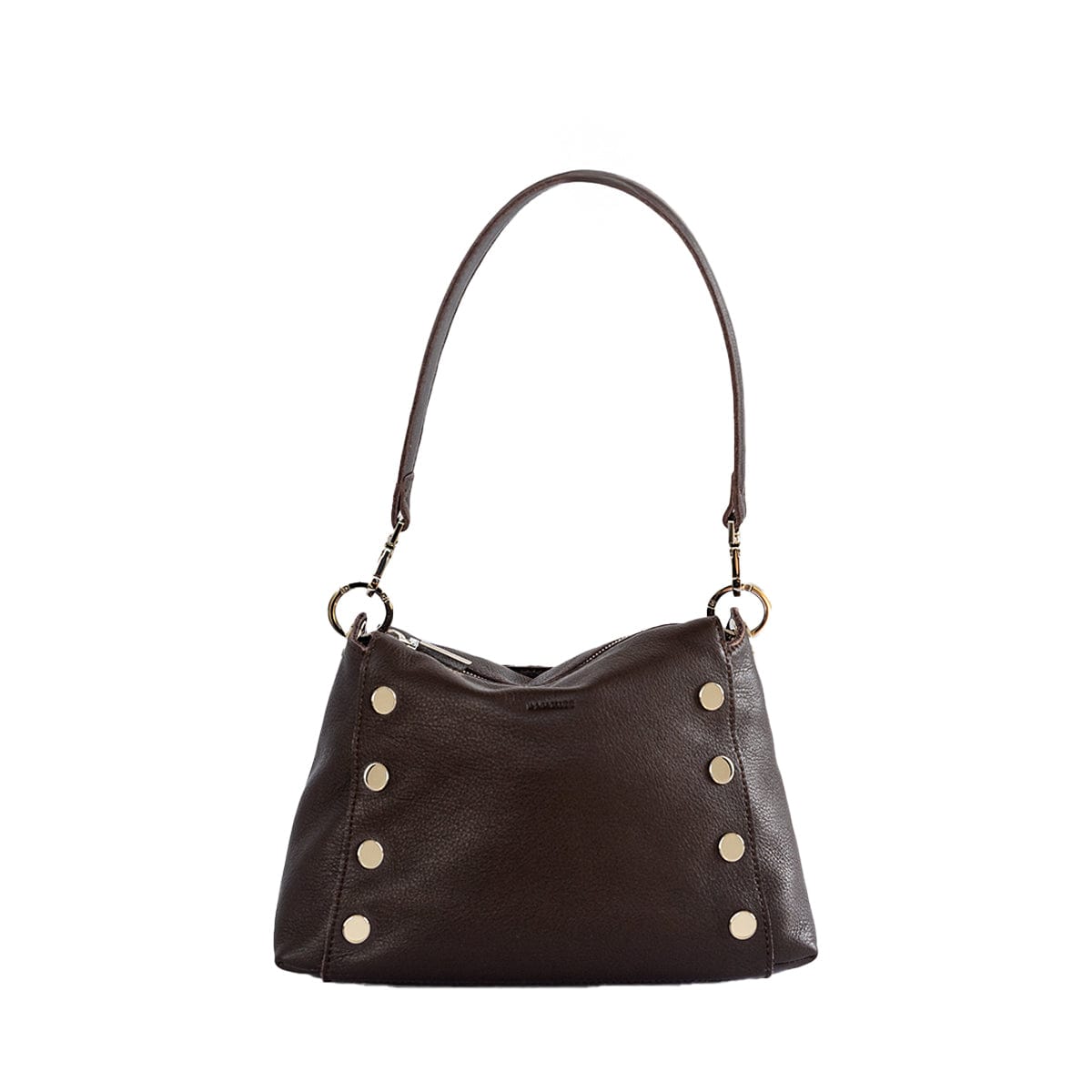 Finished , classic soft pebble leather with a hint of shine. Color is a classic dark espresso brown, reminiscent of a hot cup of coffee. Anniversarying our espresso suede brown now in our classic pebble leather. A staple color for AW'25 and a tried and true color for Hammitt and for the global palette. This color maintains its staying power.