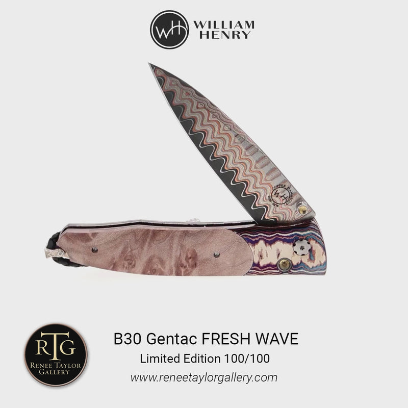 The Gentac ‘Fresh Wave’ features a beautiful frame in William Henry's signature 'Wave' mokume gane, inlaid with a beautiful piece of maple burl wood. The blade is 'Copper Wave' damascus with an extra-strong core in VG-5; the one-hand button lock and the thumb stud are set with citrine.