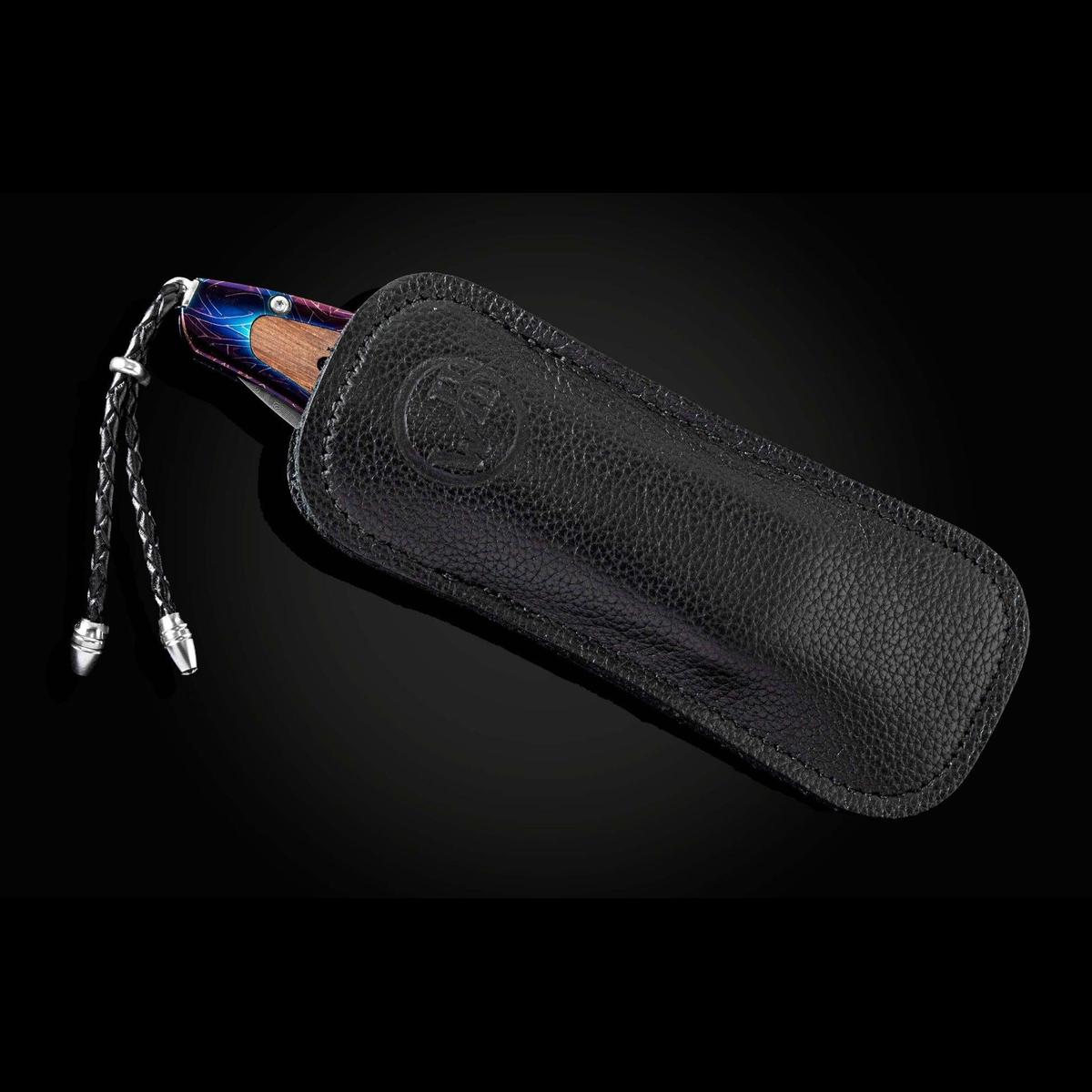 The Gentac 'Hornblower' features beautiful bolsters in hand-forged 'Brain Wave' damascus by Chad Nichols, inlaid with oak wood reclaimed during the restoration of the H.M.S. Victory.