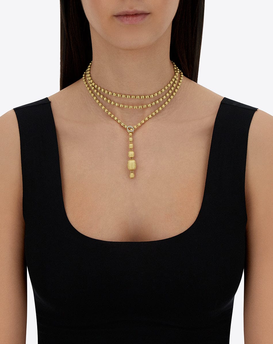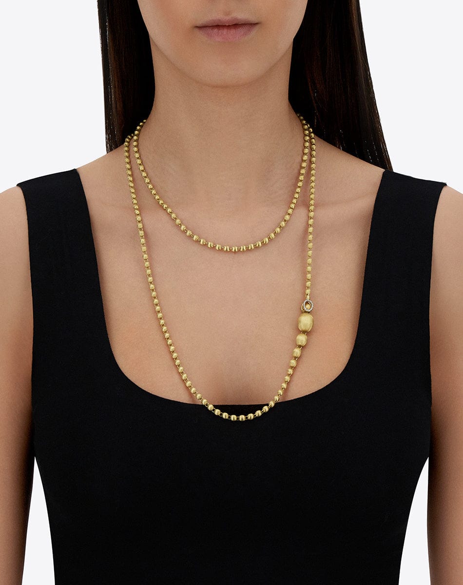 To characterize this necklace in 18kt gold and diamonds, its elegant gold pearls, hand-engraved one by one with the very ancient burin technique and surprisingly light.
