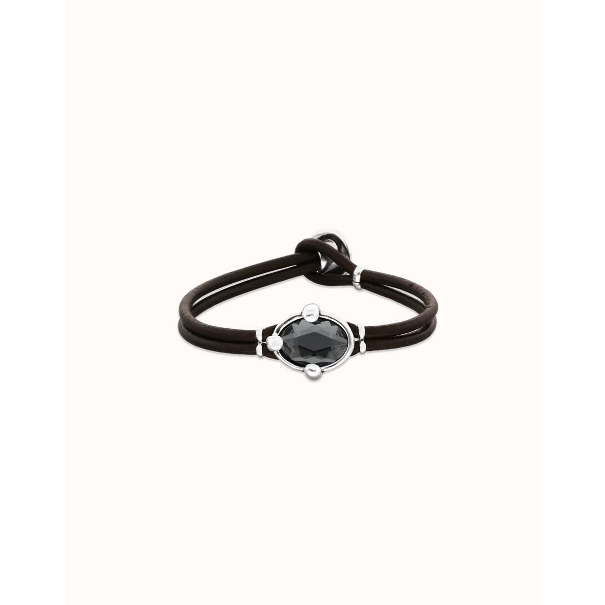 This unique piece of jewelry features a double brown leather strap design that evokes the rugged and natural side, coupled with a center element that frames an enigmatic faceted jet black crystal.