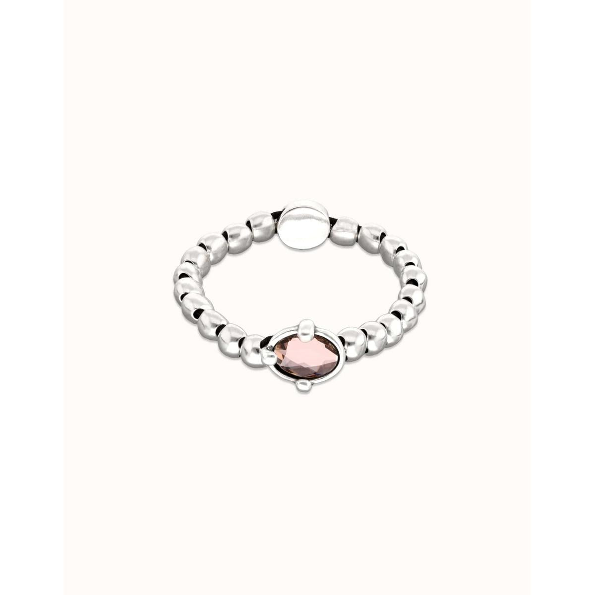 This designer piece features a chain of small beads that offer an elegant texture, enhanced by a delicate faceted crystal in a subtle pink tone.