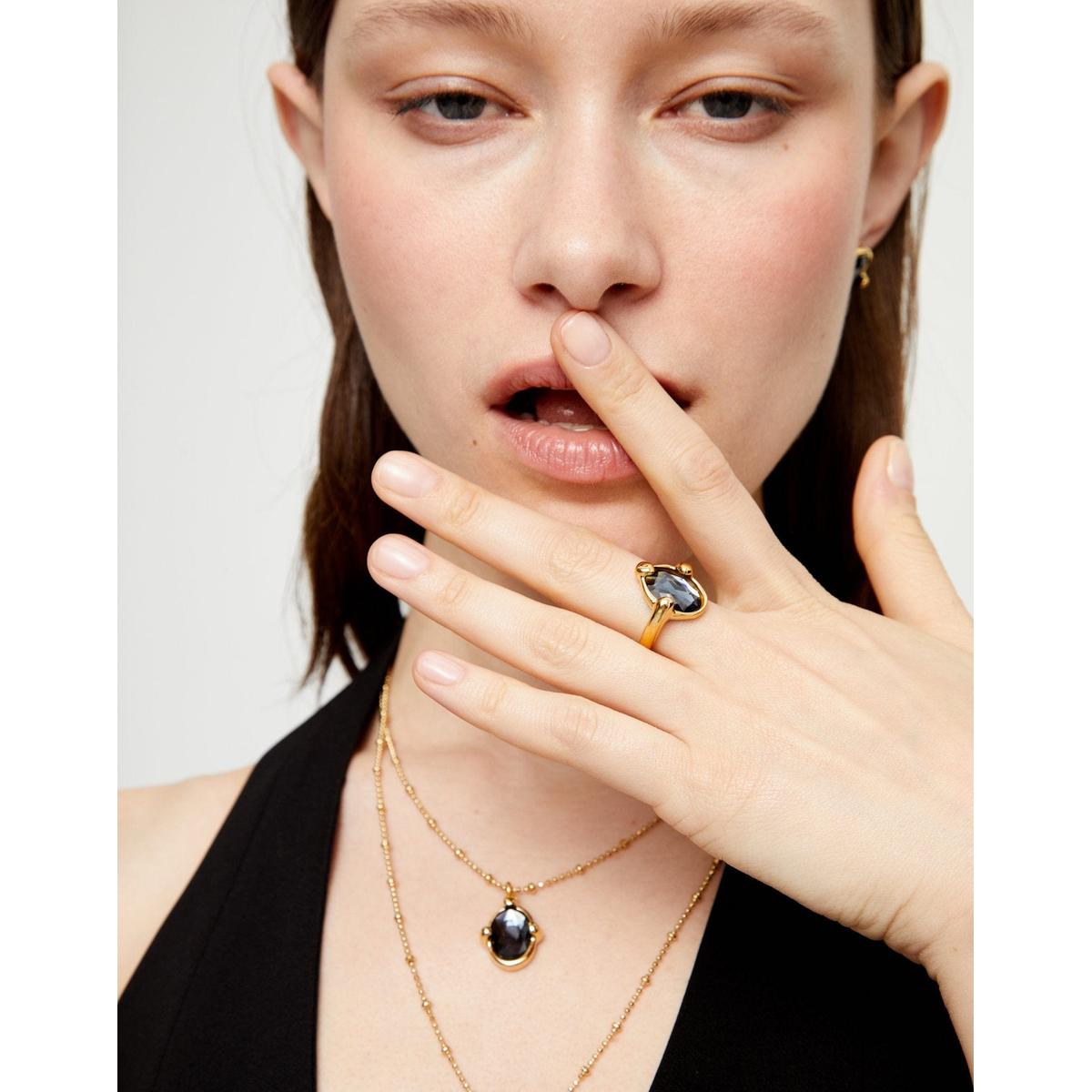 This designer jewelry fuses the warm opulence of gold tones with the robust structure that frames an enigmatic faceted crystal in a deep jet black tone.
