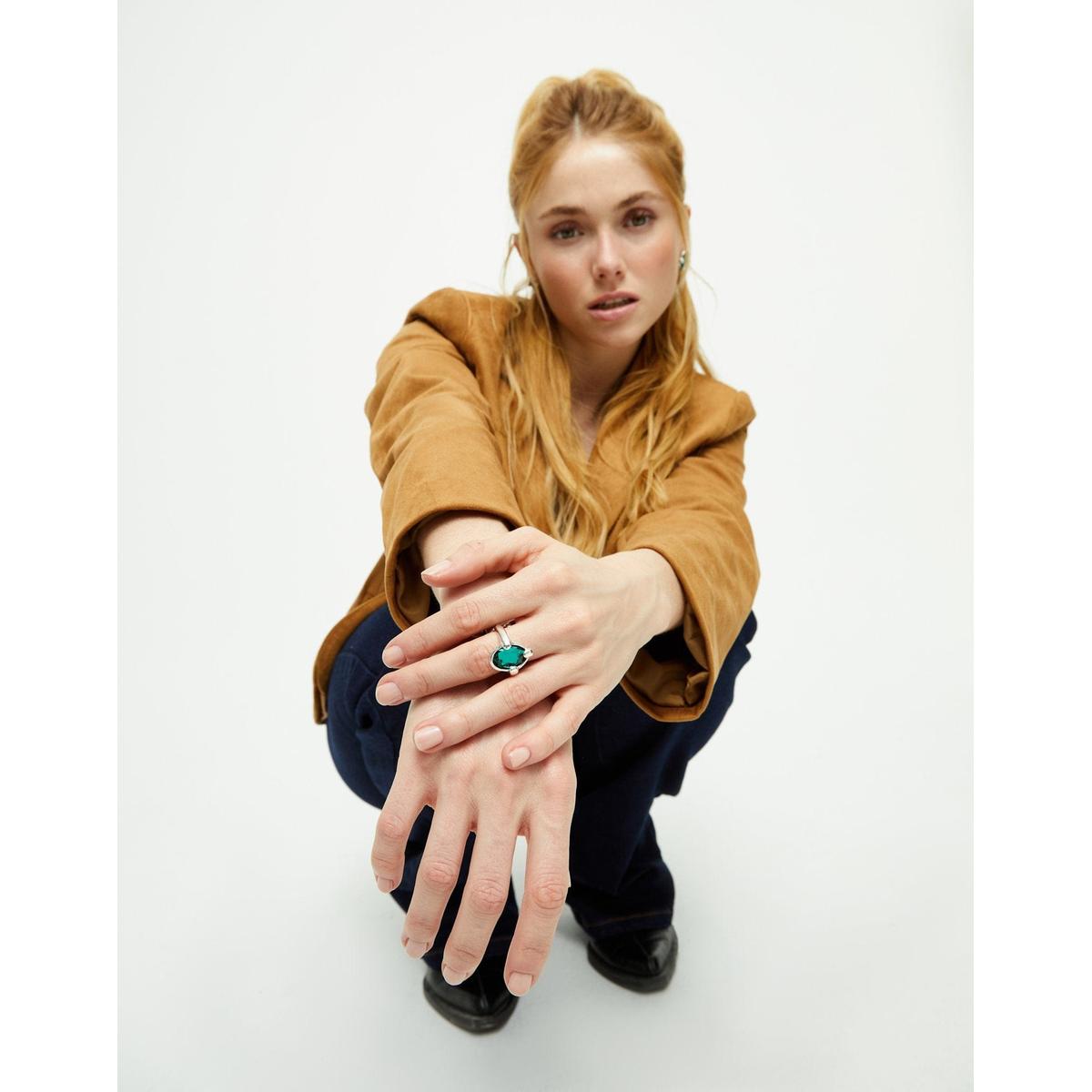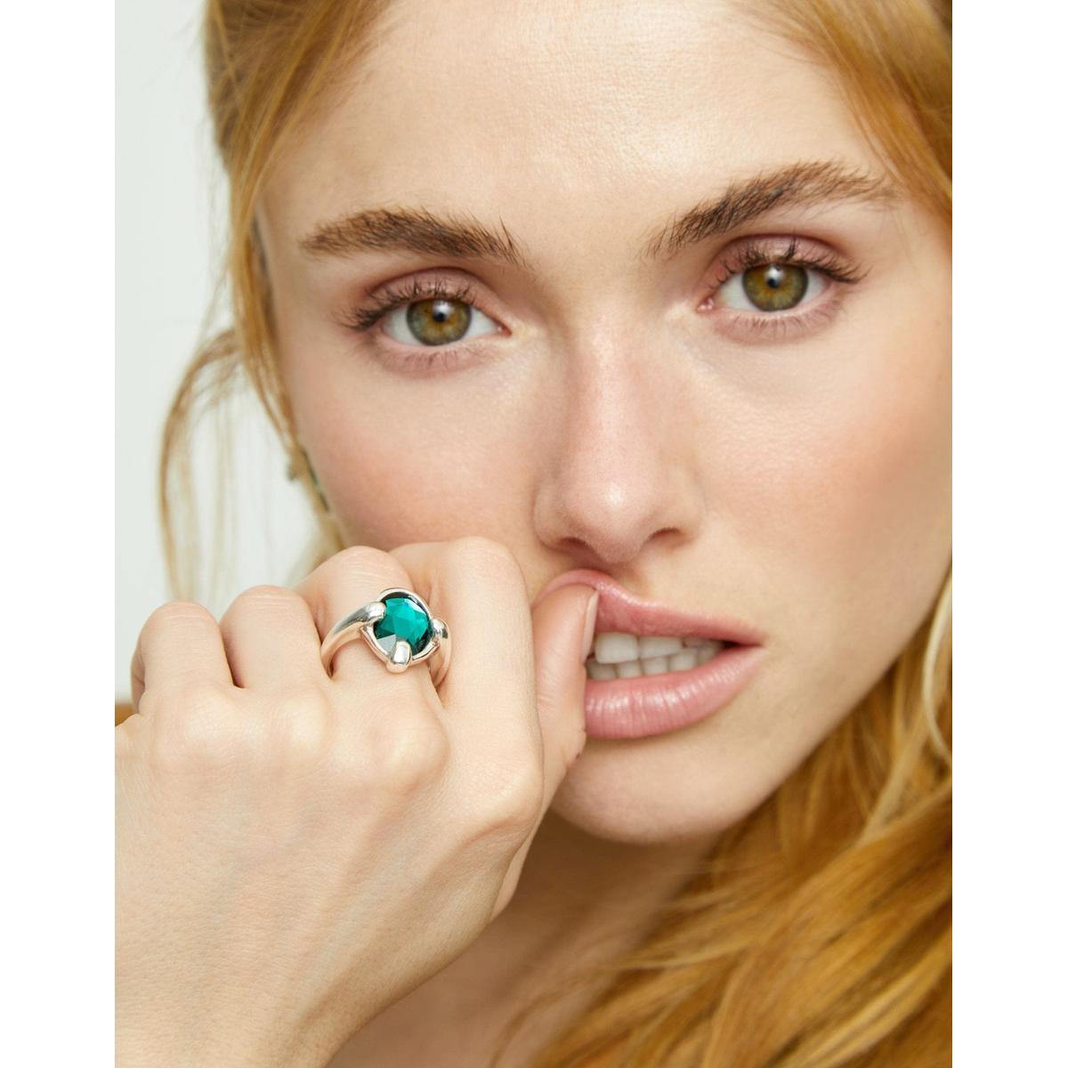 This designer jewelry piece fuses the robustness of its organic form with the deep luminosity of an emerald-toned faceted crystal.