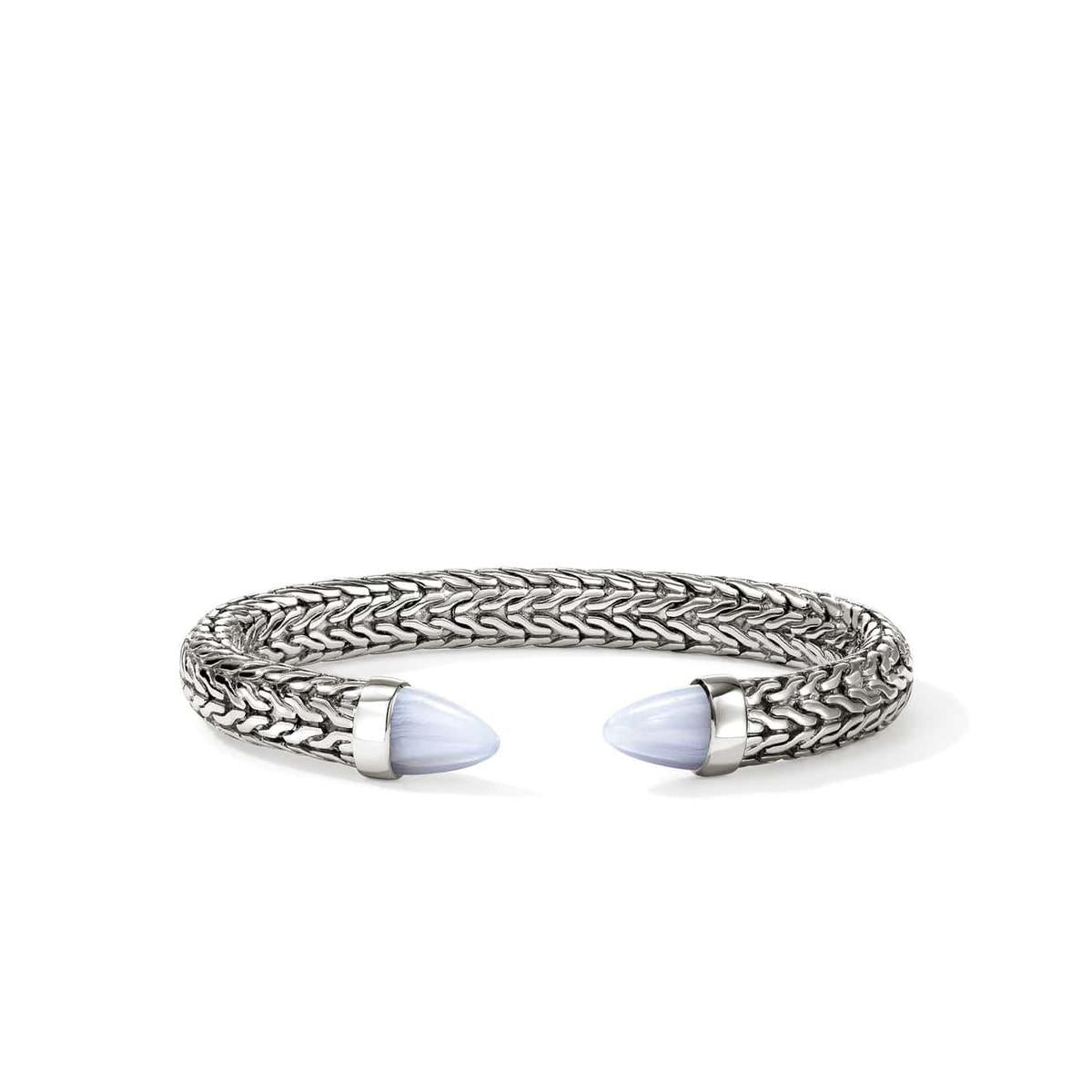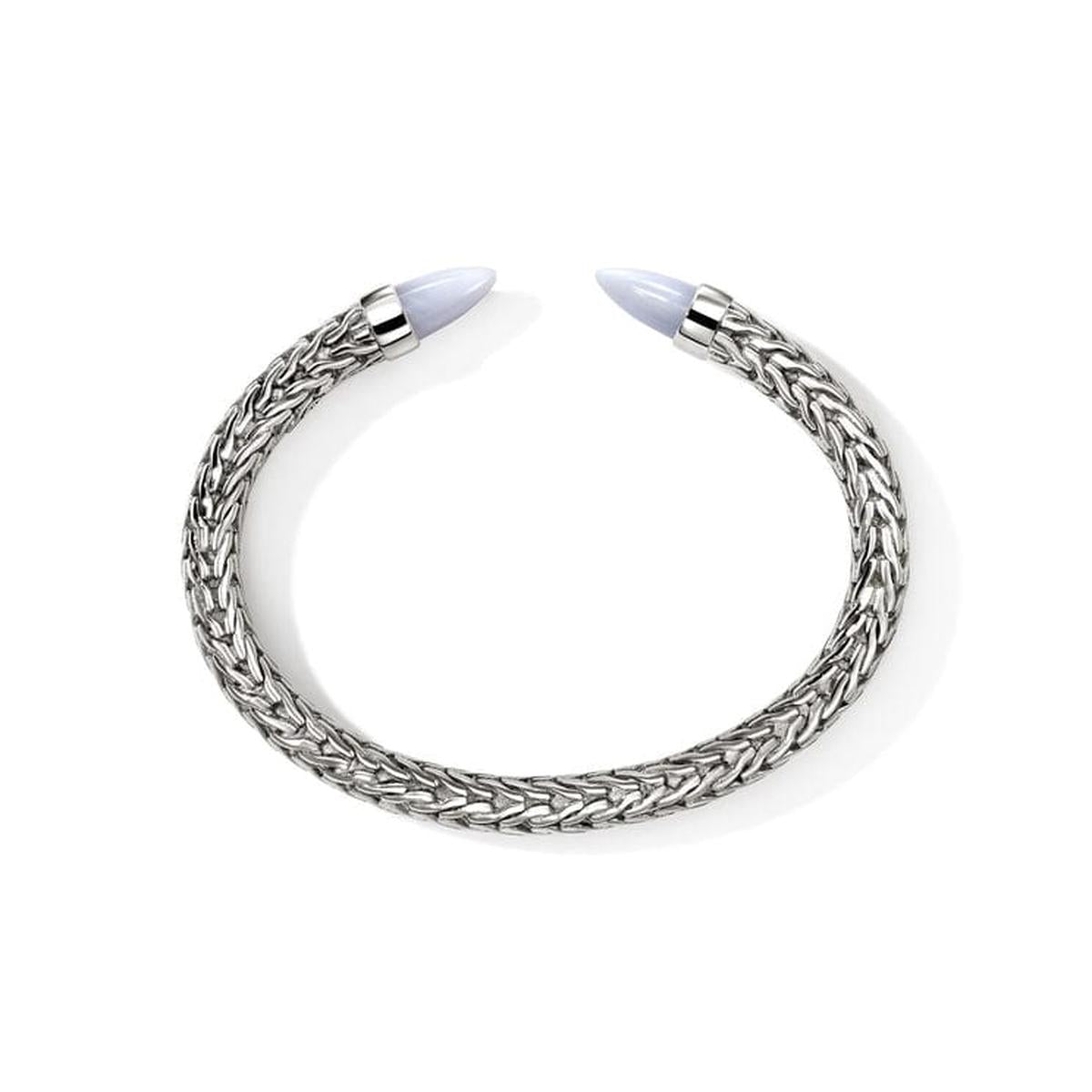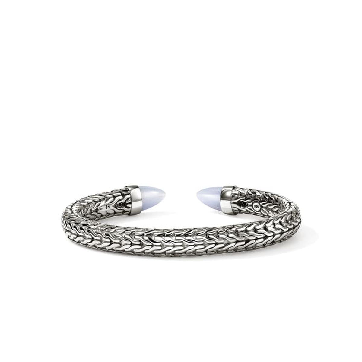 This archive-inspired flex cuff features the iconic JH carved chain motif culminating in polished hardstone tips. Artisan handcrafted in reclaimed sterling silver with ethically sourced blue lace agate.